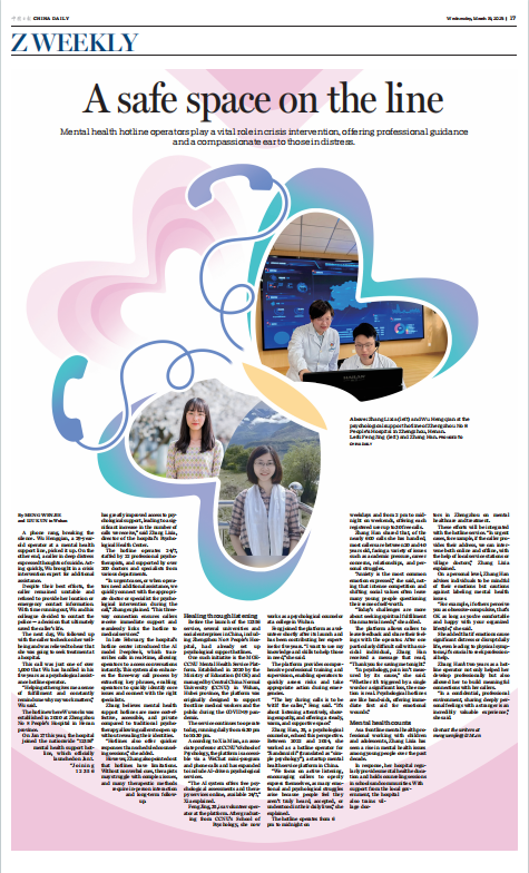 近日,《中国日报》(英文版)聚焦我校心理健康服务平台的创新实践与社会贡献,对其在心理援助领域的突出成效进行了深度报道。教育部完美网页版心理援助热线平台自2020年成立以来,始终致力于为公众提供专业、便捷的心理支持服务。